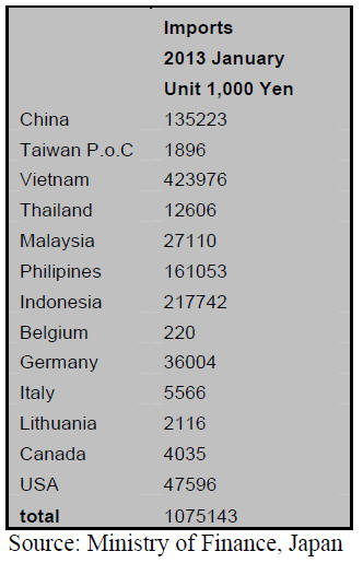 January 2013 imports of office furniture totaled Yen 2.6 bil. Up around 7%