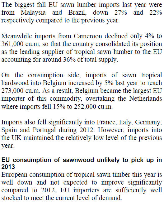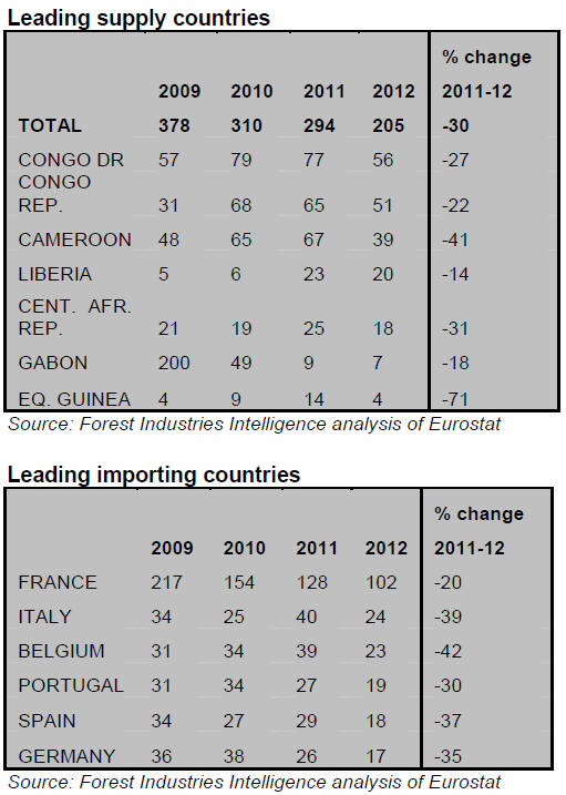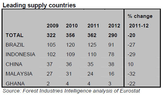 EU imports of tropical hardwood logs in 2012 were only 205,000cu.m, 30%