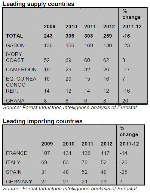 Europe¡¯s imports of tropical logs in 2012 fell substantially from all