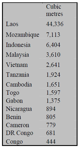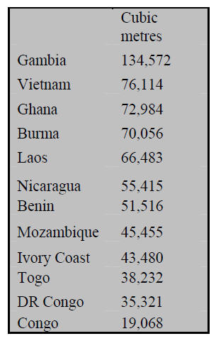 In the first quarter of 2013, China imported 250,000 cubic metres of