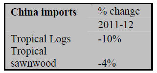 2012 imports of logs and sawnwood fell short of the levels in 2011