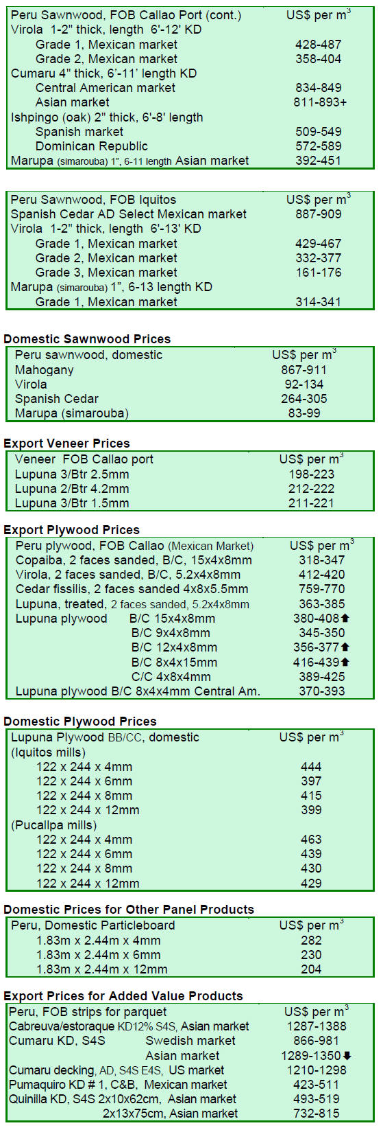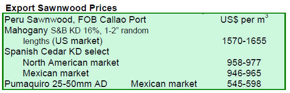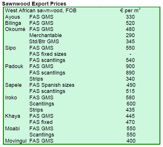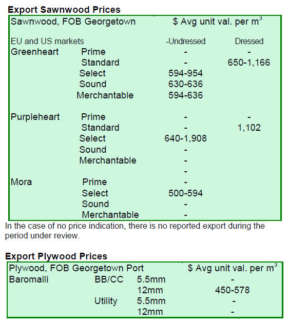 greenheart undressed sawnwood top end FOB prices fell slightly from US$1,230