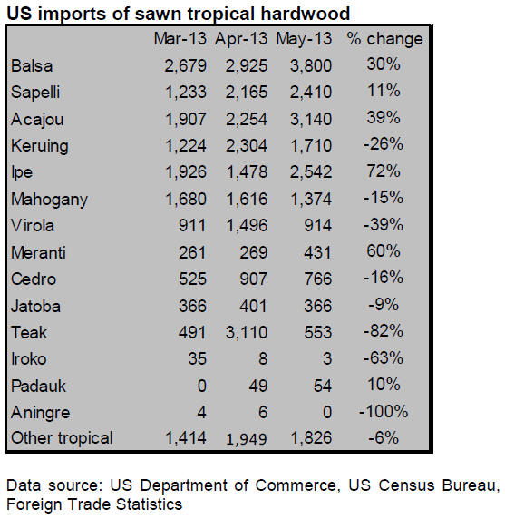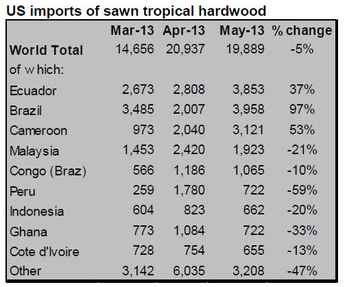 US tropical sawn hardwood imports declined by 5% in May compared to