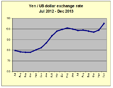 The yen weakened to105 to the US during December