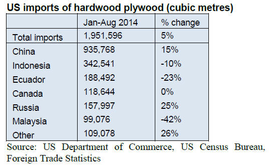 US imports of hardwood plywood fell by 11% in August
