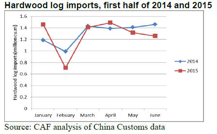 In the first half of 2015 China‟s hardwood log imports