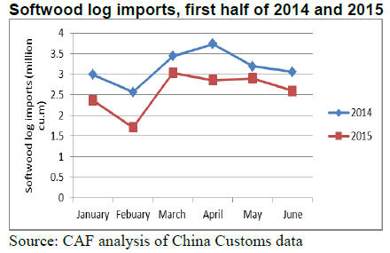 June the imports of softwood logs fell sharply while
