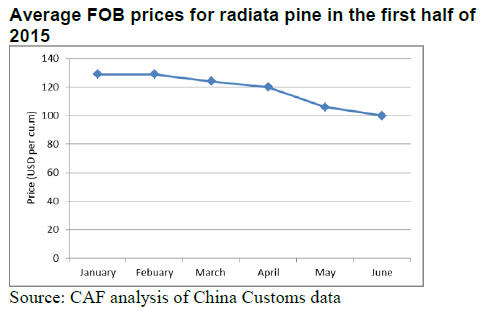 The average FOB price for radiata pine fell dramatically