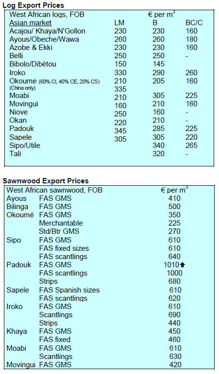 S Korea (9mm and up) US$ 400 每 410/cu.m FOB