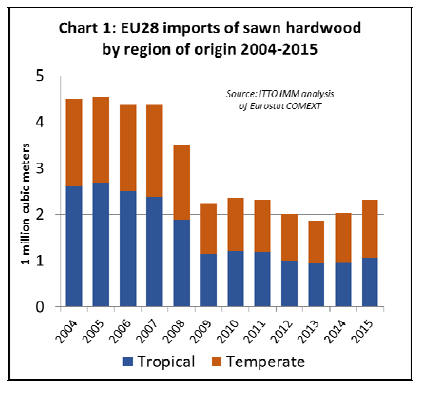 In 2015, EU imports of tropical sawn hardwood were 1.05