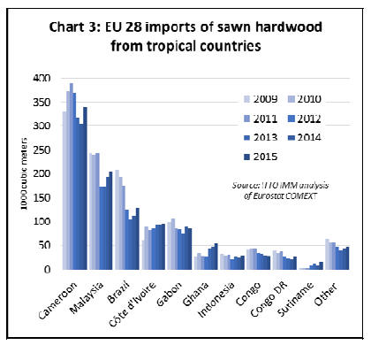 EU tropical sawn hardwood imports rose 9% in 2015