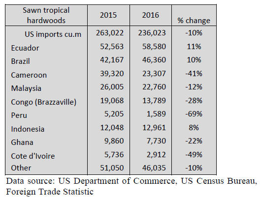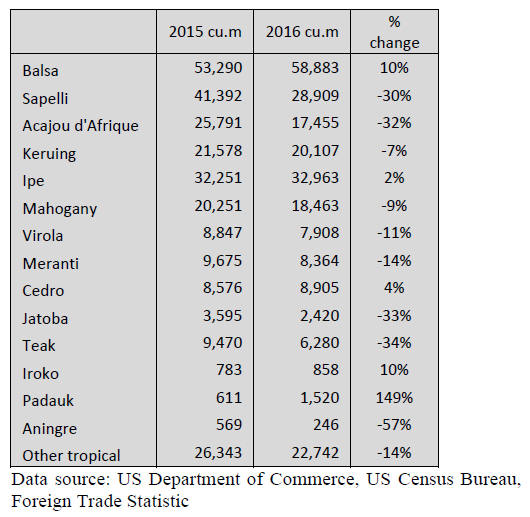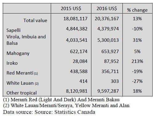 Canadian tropical sawnwood imports firmed in 2016