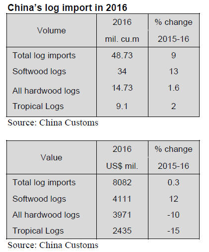 Tropical log imports in 2016 totalled 9.1 million cubic