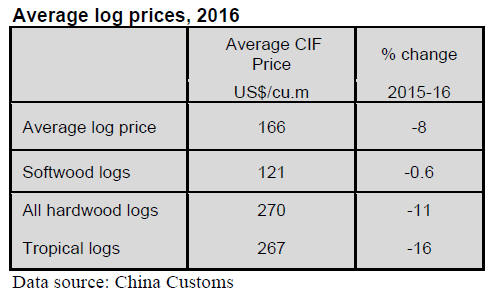 average price for imported hardwood logs in 2016 was