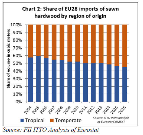 In 2016, EU imports of temperate sawn hardwood