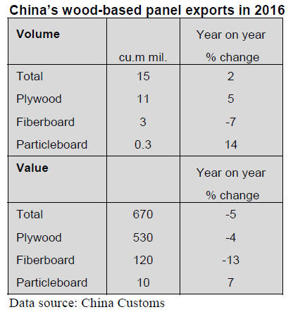 China¡¯s wood-based panel exports in 2016 totalled 15