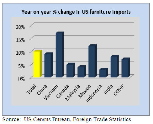 and China. Furniture imports from Vietnam grew 22% to
