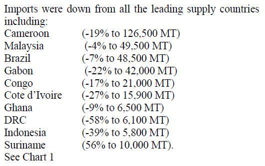 stable at 34,200 MT and imports from Gabon fell 16% to