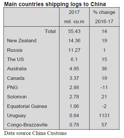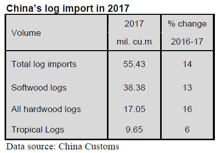 China¡¯s log imports in 2017 totalled 55.43 million cubic