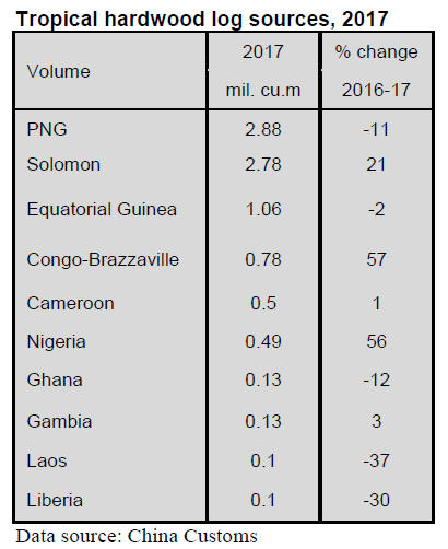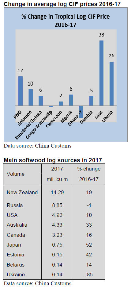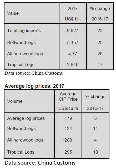 Tropical log imports in 2017 totalled 9.65 million cubic