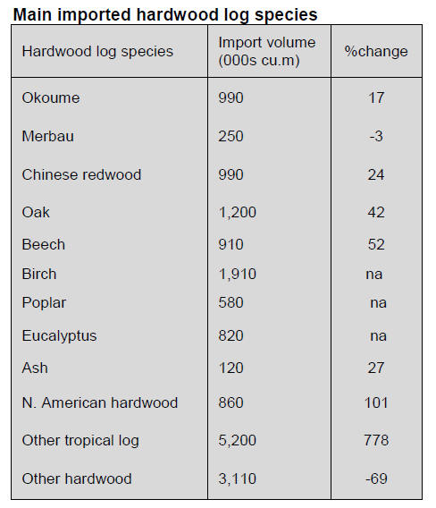 hardwood log imports rose 52%, 42%, 27% and 24%