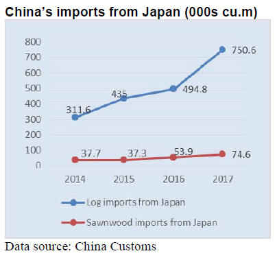 In 2017 China¡¯s sawnwood imports from Japan were 74,