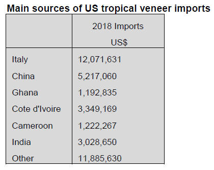 Imports of tropical veneers in 2018 expanded 26% over
