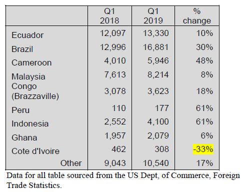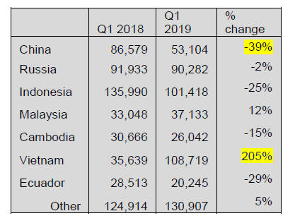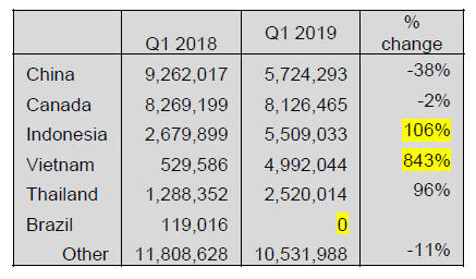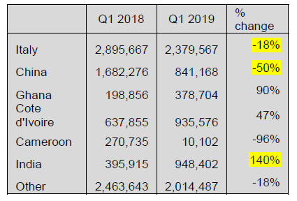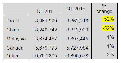 No shipments from Brazil in Q1 2019