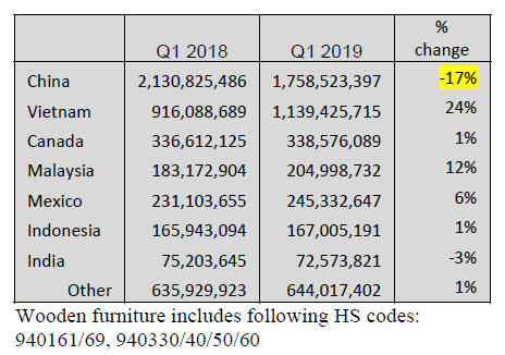 US imports of wooden furniture fell by 9% in March.
