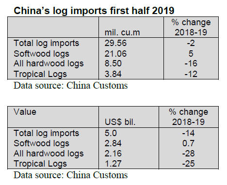 China¡¯s log imports in the first half of 2019 totalled 29.56 million