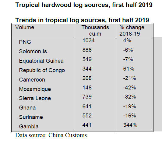 Tropical log imports from Gambia and the Republic of Congo surged 344% and