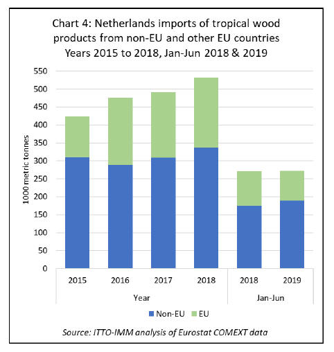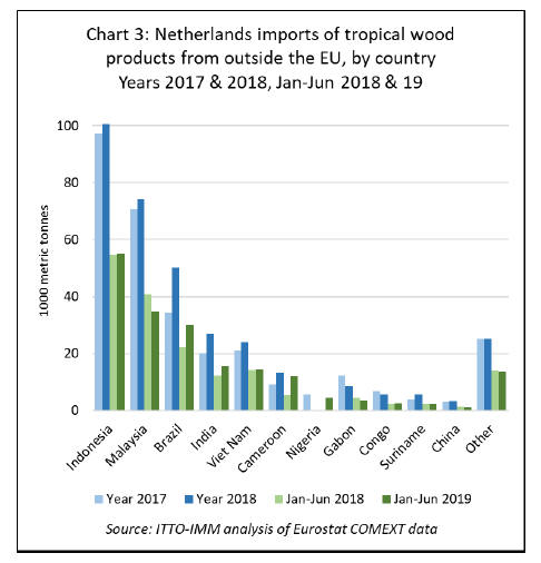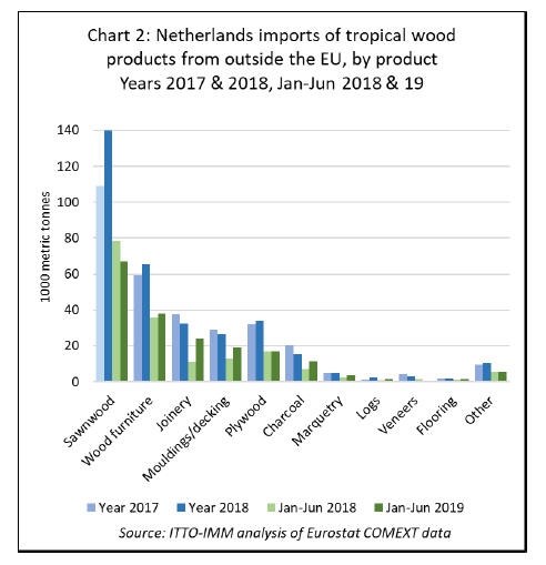 Much of the gain in Netherlands tropical wood imports in 2018 was in