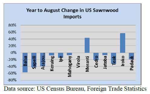 US imports of sawn tropical hardwood slowed in August, falling 25% from