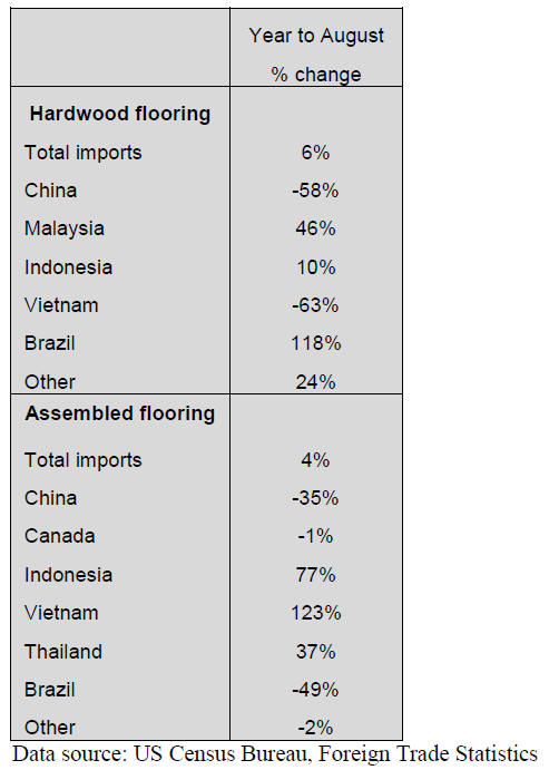 US imports of hardwood flooring fell by 20% in August, declining for a