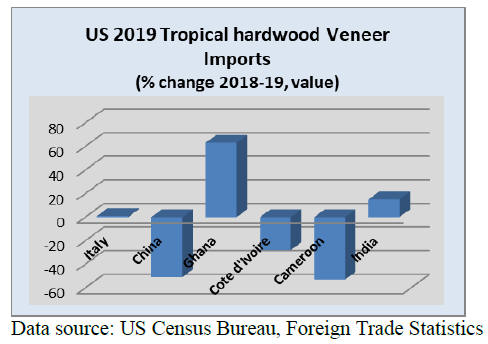 US Imports of tropical hardwood veneer fell by 19% in 2019 as imports
