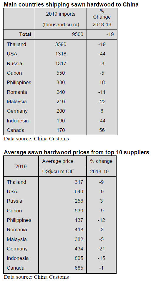 Sawn hardwood imports fell 19% to 9.5 million cubic