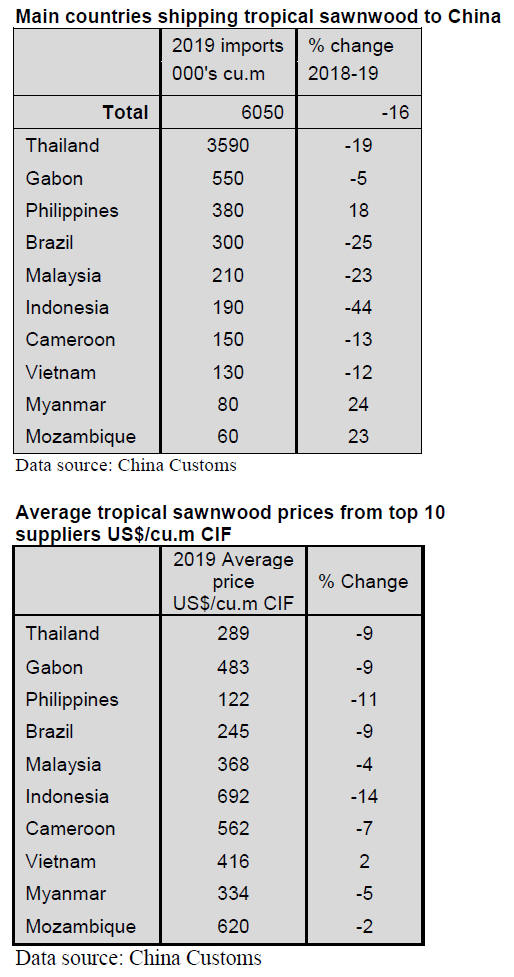 China and 2019 tropical sawnwood imports from Thailand