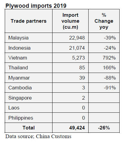 China¡¯s plywood imports from ASEAN in 2019 fell to