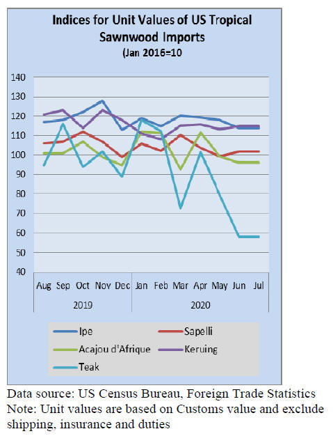 July imports of sawn tropical hardwood rose 16% month
