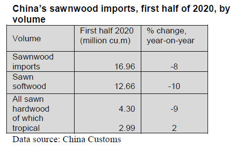 sawnwood imports in the first half of 2020, at 1.67 million