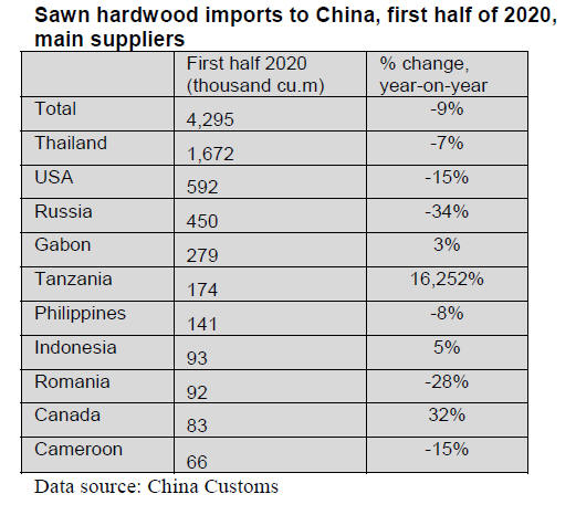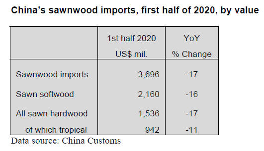 imported sawn hardwoods in the first half of 2020 was