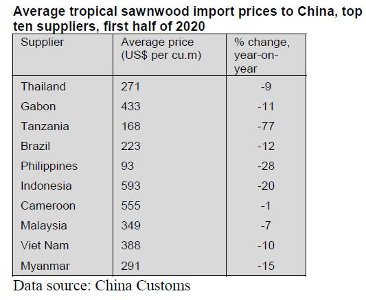 The average price of imported tropical sawnwood was