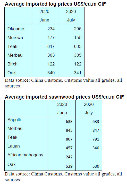 all sawn hardwood imports) in the first half of 2020, up by