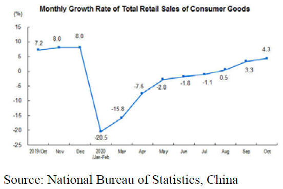 In October, retail sales of consumer goods rose 4.3% yearon-
