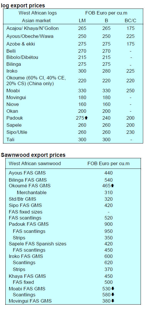 increase in FOB prices for sawn okoume.