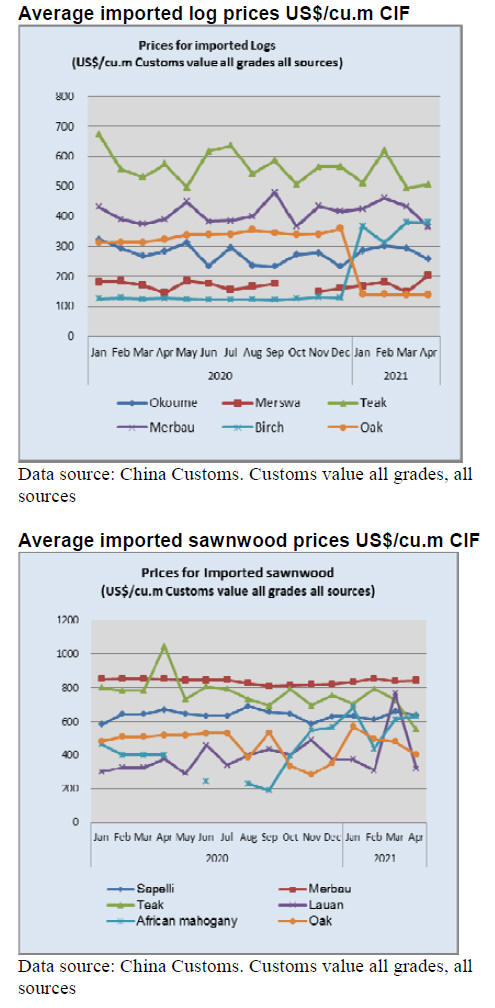 The average price for imported logs from Myanmar fell to