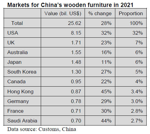 furniture exports rose 28% to US$25.62 billion in 2021.