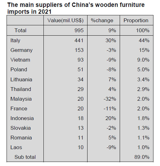 2021 total. The value of China¡¯s wooden furniture imports