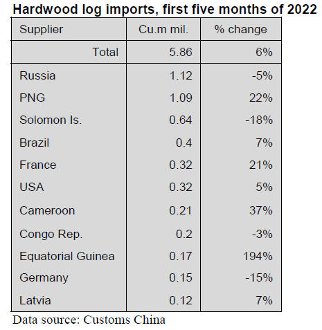 Hardwood log imports rose 6% to 5.86 million cubic