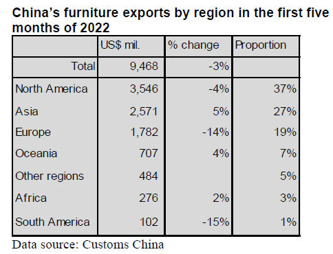 Chinese furniture exports to Asia, Oceania and
